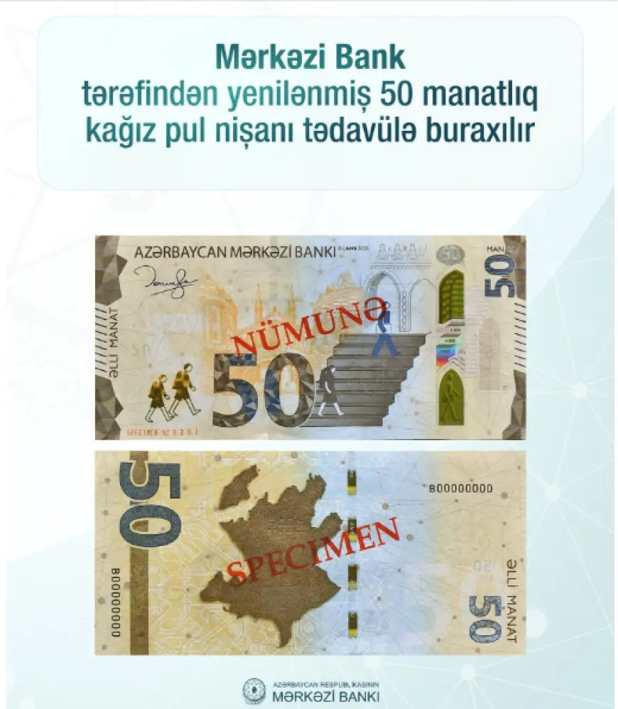Bu gündən Azərbaycan Mərkəzi Bankının sədri Taleh Kazımovun imzasının əks olunduğu yenilənmiş 50 manatlıq kağız pul nişanı tədavülə buraxılır.