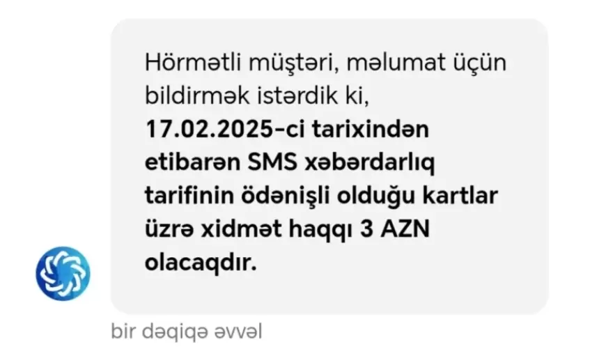 Ajans.az xəbər verir ki, fevralın 17-dən etibarən SMS xəbərdarlıq tarifinin ödənişli olduğu kartlar üzrə xidmət haqqının 3 AZN olacağı bildirilib.