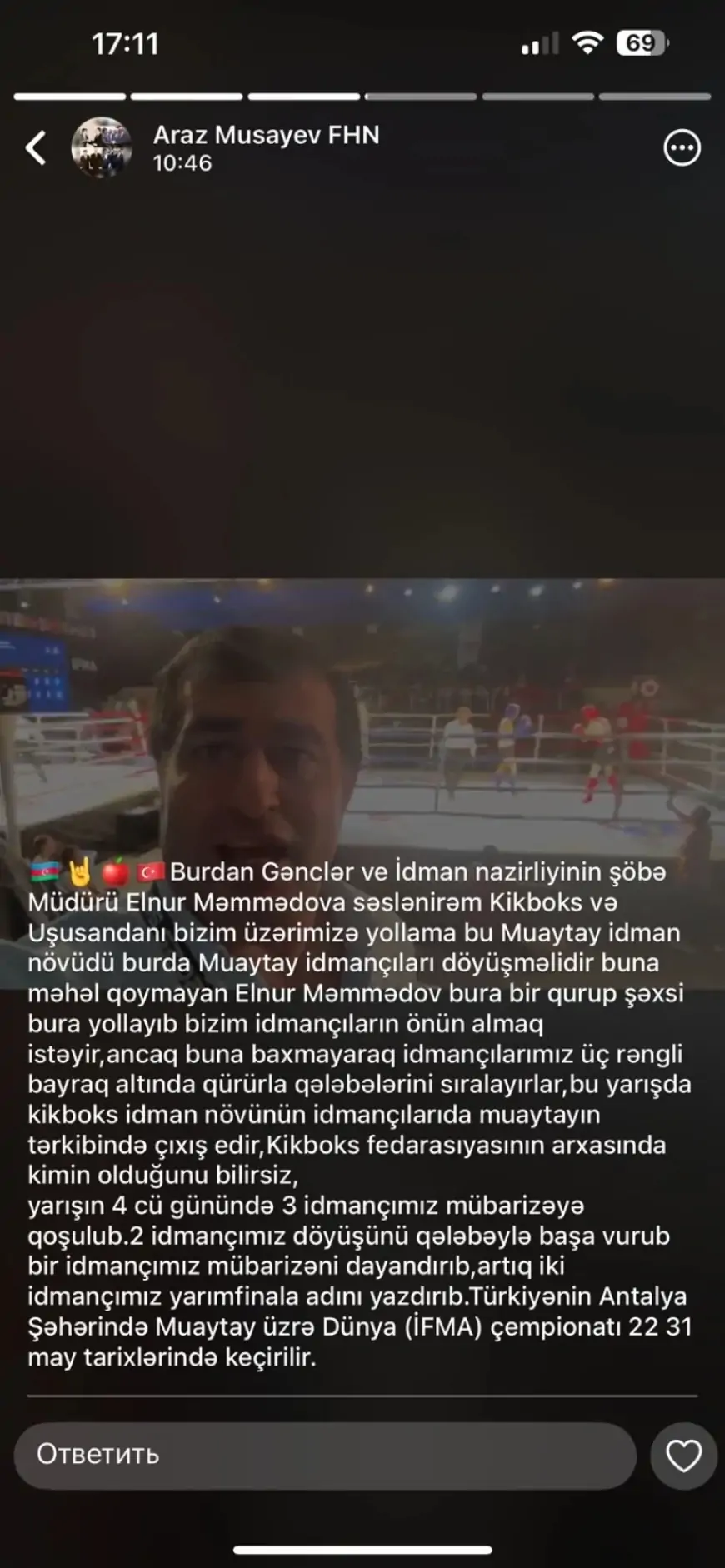 O paylaşdığı statuslarda Gənclər və İdman Nazirliyinin şöbə müdiri Elnur Məmmədovu ittiham edib.