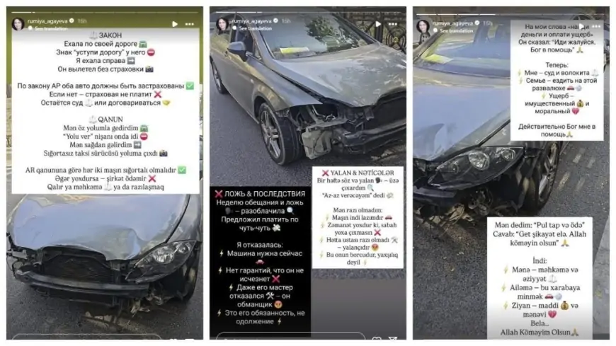 Onun sözlərinə görə, taksi sürücüsü "Yol ver" nişanını pozub və nəticədə qəzaya səbəb olub. Taksi sürücüsünün sığortası olmadığına görə məsələ daha qəliz hal alıb.