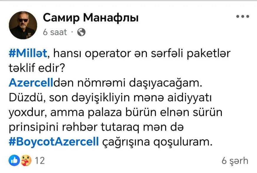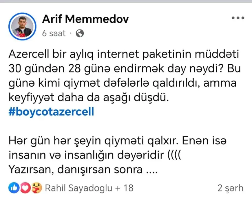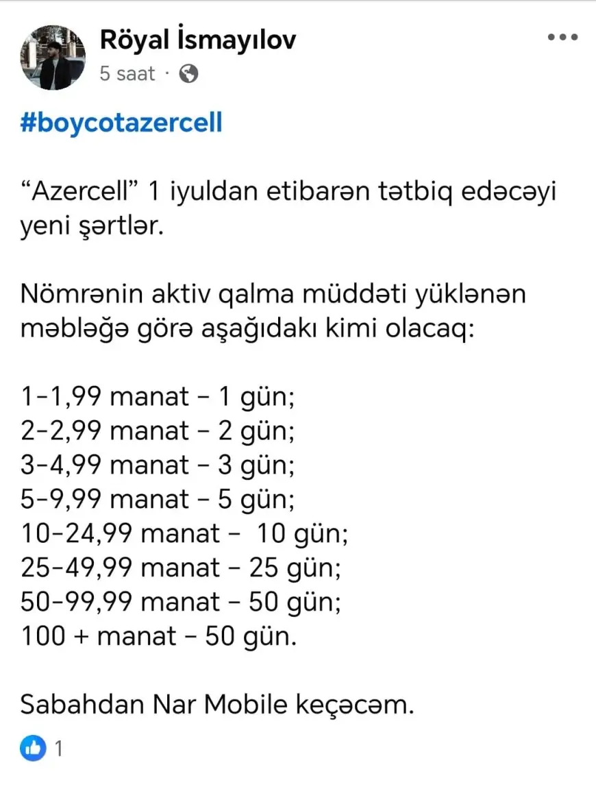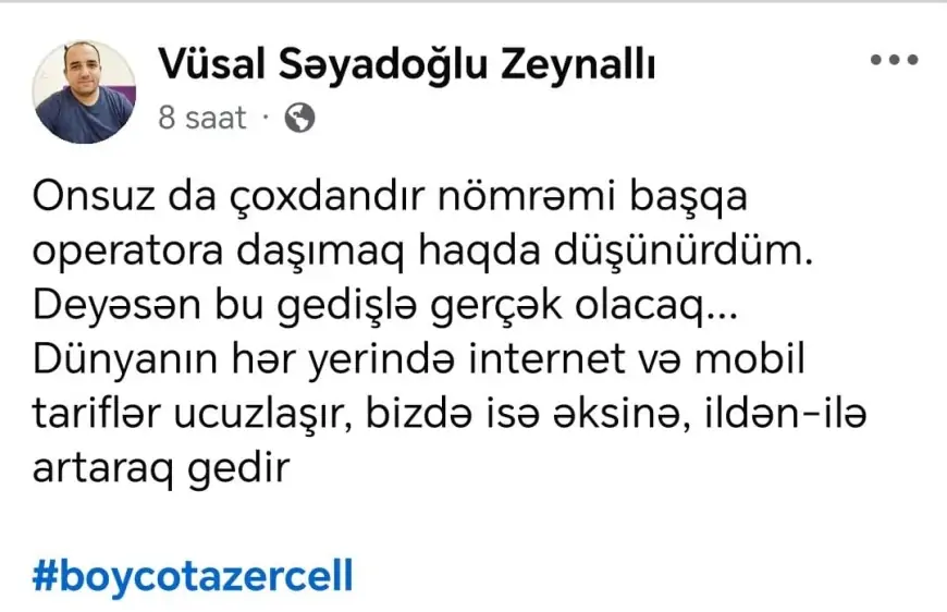 "Azercell”in yeni qərarı abonentlərin narazılığına səbəb olub. Abonentlər sosial şəbəkələrdə #BoycotAzercell haştağı ilə kampaniya başladaraq provayderin yeni qərarına qarşı birləşiblər.