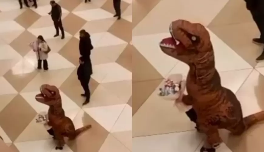 SAVASHMEDİA.az xəbər verir ki, qonağını qarşılamaq üçün gələn şəxs dinozavr kostyumu geyinib.