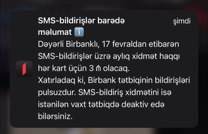 Qeyd edilib ki, 17 fevraldan etibarən SMS-bildirişlər üzrə aylıq xidmət haqqı hər kart üçün 3 manat olacaq.