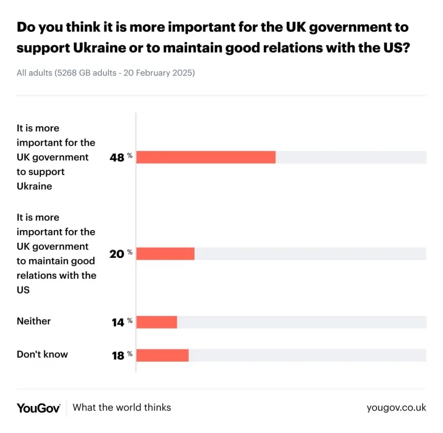 Sorğuda iştirak edən britaniyalı respondentlərin 48%-i Britaniya hökumətinin Ukraynaya dəstək verməsinin daha vacib olduğunu, 20%-i ABŞ ilə yaxşı münasibətlərin saxlanmasının daha vacib olduğunu bildirib. Onların 14%-i bu variantlardan heç birini seçməyib, 18%-i isə qərarsız olduğunu söyləyib.