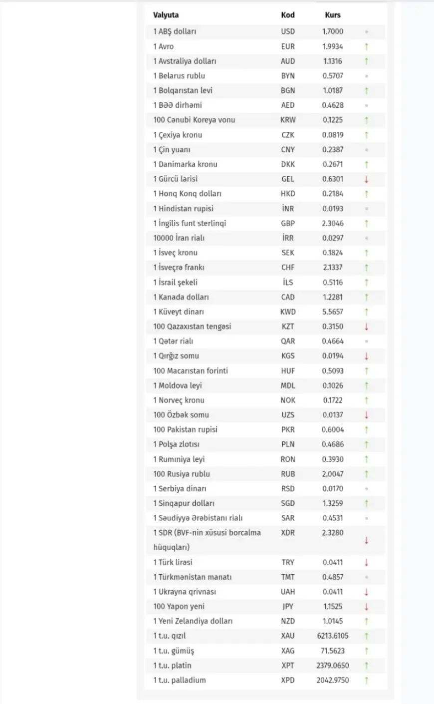Azərbaycan Mərkəzi Bankı bu günün valyuta məzənnələrini açıqlayıb.