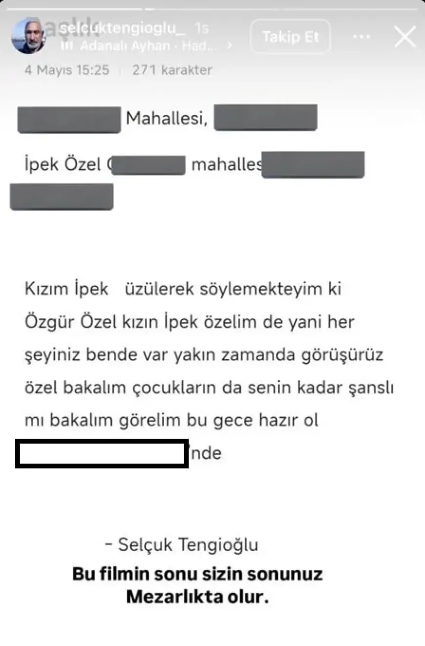 SAVASHMEDİA.az xəbər verir ki, CHP sədrinə hücum edən Səlcuq Tengioğlunun adına açılan saxta hesabdan Özgür Özəlin qızı İpək Özelin ünvan məlumatları paylaşılıb və “bu film qəbiristanlıqda bitəcək” tipli ölüm təhdidləri edilib.