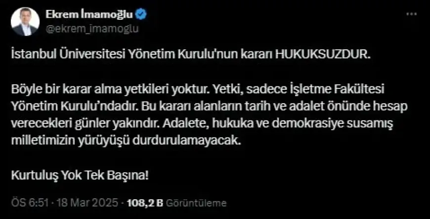 “İstanbul Universiteti İdarə Heyətinin qərarı QANUNSUZDUR. Onun belə bir qərar vermək səlahiyyəti yoxdur. Səlahiyyət yalnız Biznesin İdarəedilməsi Fakültəsinin İdarə Heyətindədir. Onların bu qərara görə tarix və ədalət qarşısında cavab verəcəyi gün yaxındır. Ədalətə, hüquqa, demokratiyaya susamış millətimizin yürüşünü dayandıra bilməyəcəklər"