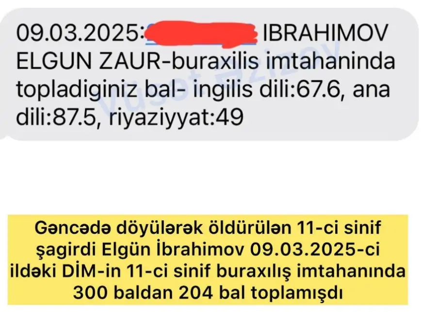 Gəncədə döyülərək öldürülən 11-ci sinif şagirdi Elgün İbrahimovun mayın 4-də verdiyi Azərbaycan dili imtahanının nəticəsi açıqlanıb.