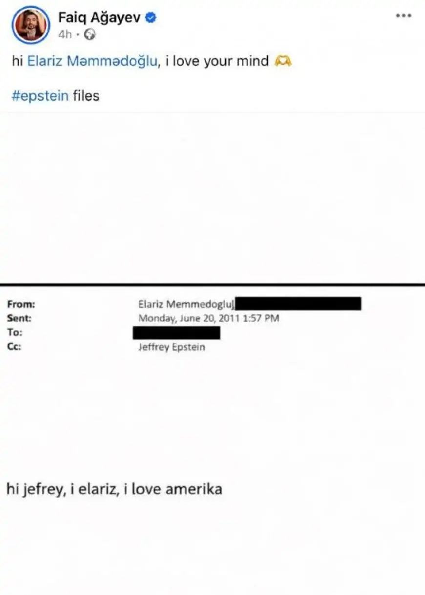 SAVASHMEDİA.az xəbər verir ki, paylaşımda Elarizin onlarla azyaşlı qızın istismar edildiyi şəbəkə ilə bağlı ittiham olunan milyarder Ceffri Epşteynə yazdığı elektron məktub yer alıb. Məktub 2011-ci ilə aid olub.