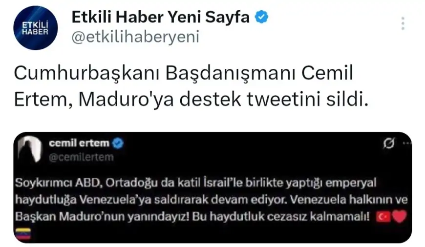 Ərdoğan Maduro səhvlər, ədalətsizliklər edərkən də bir söz deməmişdi, bu gün Venesuelaya qarşı səhv edilərkən, ABŞ BMT nizamnaməsini pozarkən də Trampdan qorxduğu üçün bir kəlmə deyə bilmədi. Müşaviri ABŞ əməliyyatına qarşı çıxan bir tvit yazdı, onu belə sildirdi. Trampı rejimi dünya nizamı ola bilməz”.