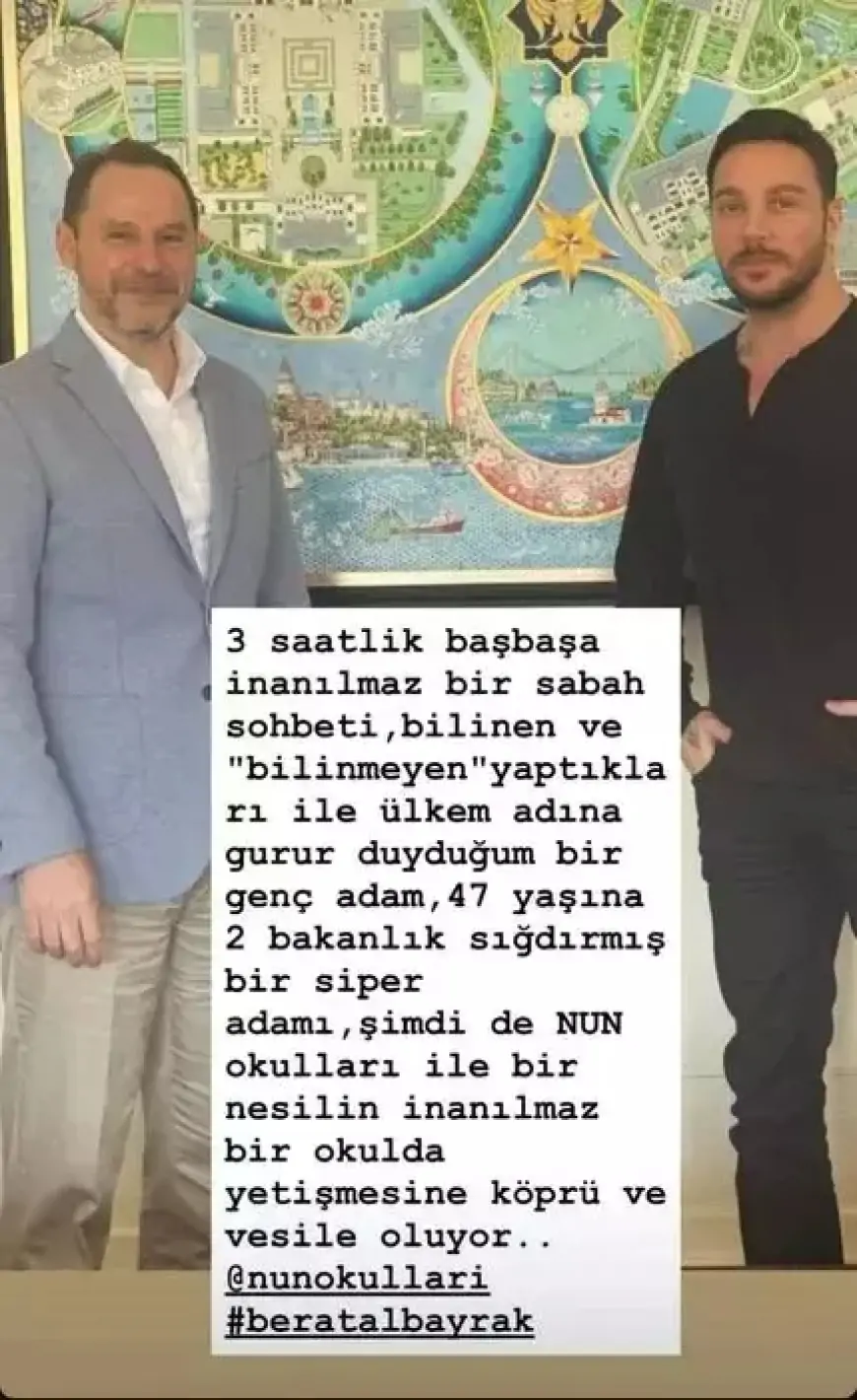 Sinan Akçıl Albayraqla çəkdirdiyi fotosuna “Birgə 3 saatlıq möhtəşəm səhər söhbəti. Ölkəm üçün bilinən və bilinməyən xidmətləri ilə qürur duyduğum bir gənc şəxsiyyət. 47 yaşına iki nazirlik sığışdırmış səngər adamı. İndi də “NUN məktəbləri” ilə bir nəslin möhtəşəm məktəblərdə yetişməsinə körpü və səbəb olur” şərhini yazıb.