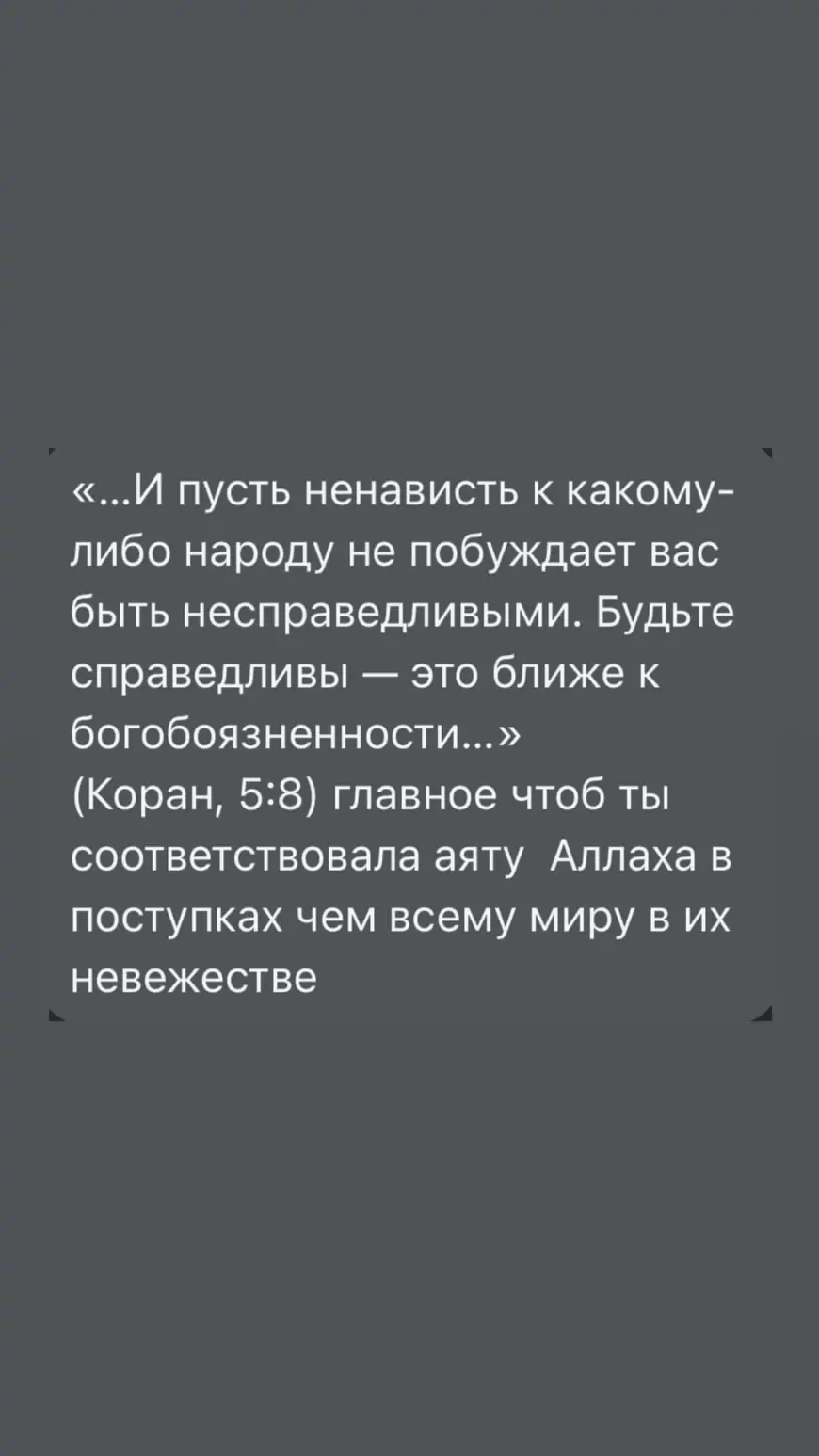 SAVASHMEDİA.az xəbər verir ki, müğənni Quranın əl-Maidə surəsinin (5-ci surə) 8-ci ayəsini paylaşaraq tənqid edənlərə reaksiya verib: