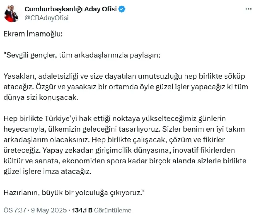 İstanbul Böyükşəhər Bələdiyyə başqanı Əkrəm İmamoğlu “Prezidentliyə Namizəd Ofisi” profilindən paylaşım edib.
