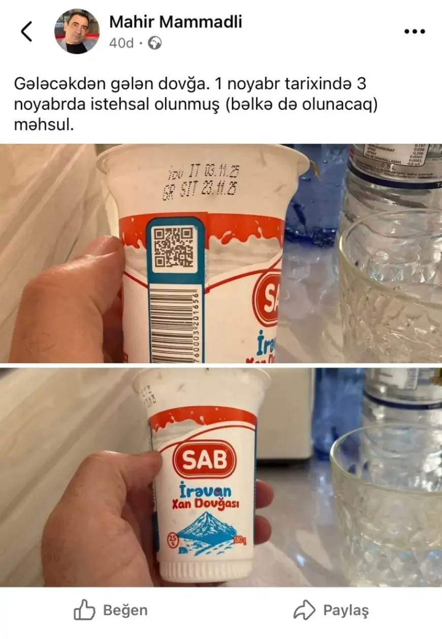Sosial şəbəkədə “SAB” qida brendinə məxsus dovğanın istehsal tarixinin noyabrın 3-də qeyd edildiyi diqqət çəkib.