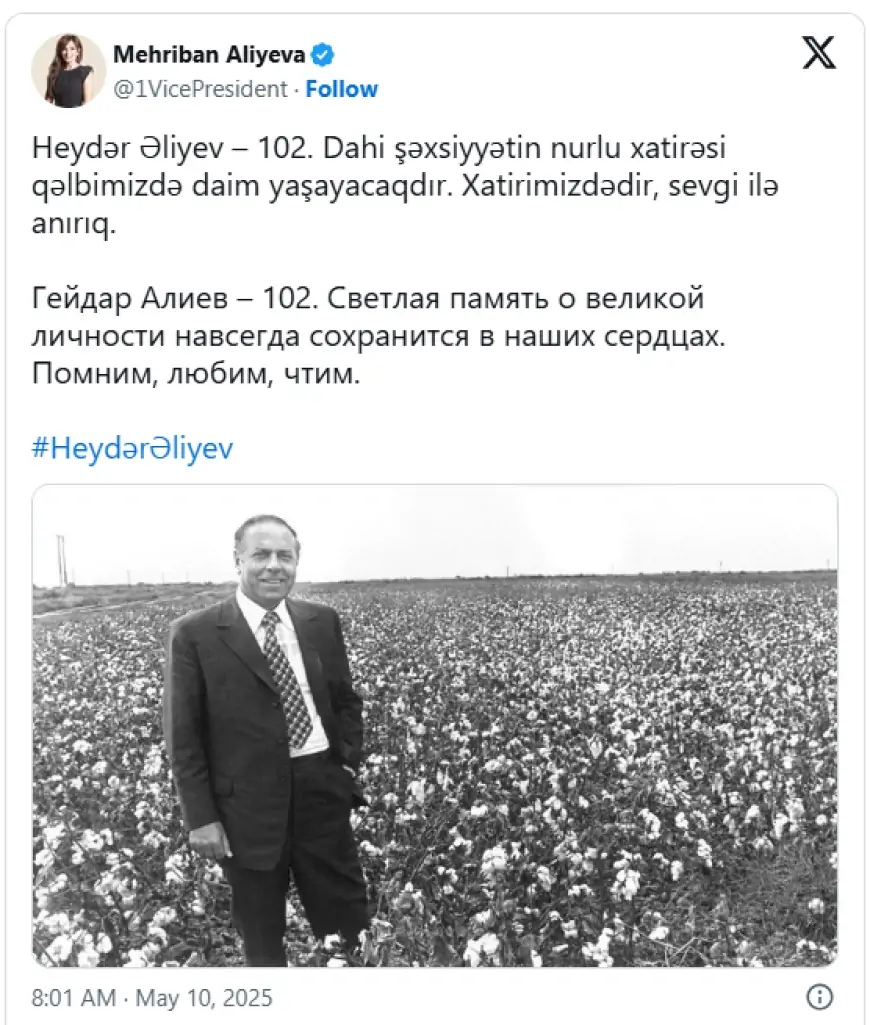 “Heydər Əliyev – 102. Dahi şəxsiyyətin nurlu xatirəsi qəlbimizdə daim yaşayacaqdır. Xatirimizdədir, sevgi ilə anırıq”.