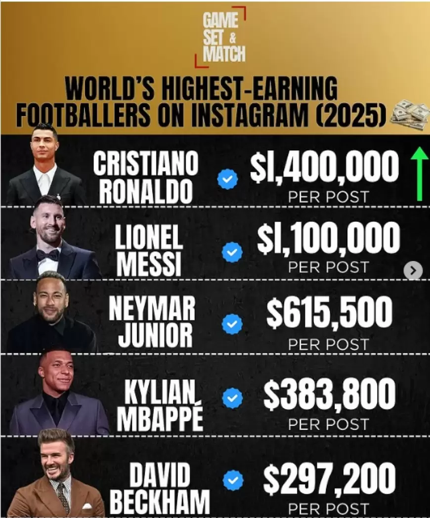 “Game Set & Match” şirkəti məşhur futbolçuların “İnstaqram” sosial şəbəkəsində reklam vasitəsilə əldə etdikləri gəlirləri dərc edib.