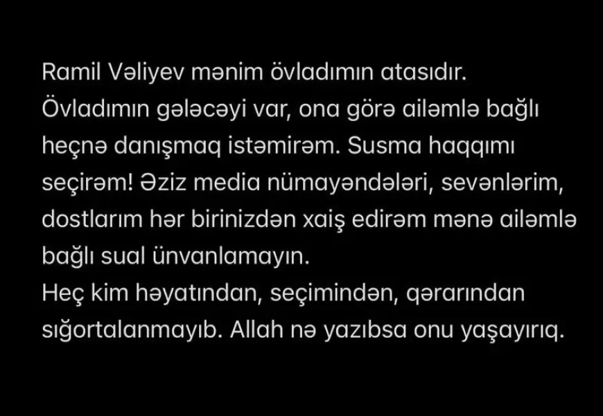 “Ramil Vəliyev mənim övladımın atasıdır. Övladımın gələcəyi var, ona görə ailəmlə bağlı heçnə danışmaq istəmirəm. Susma haqqımı seçirəm!