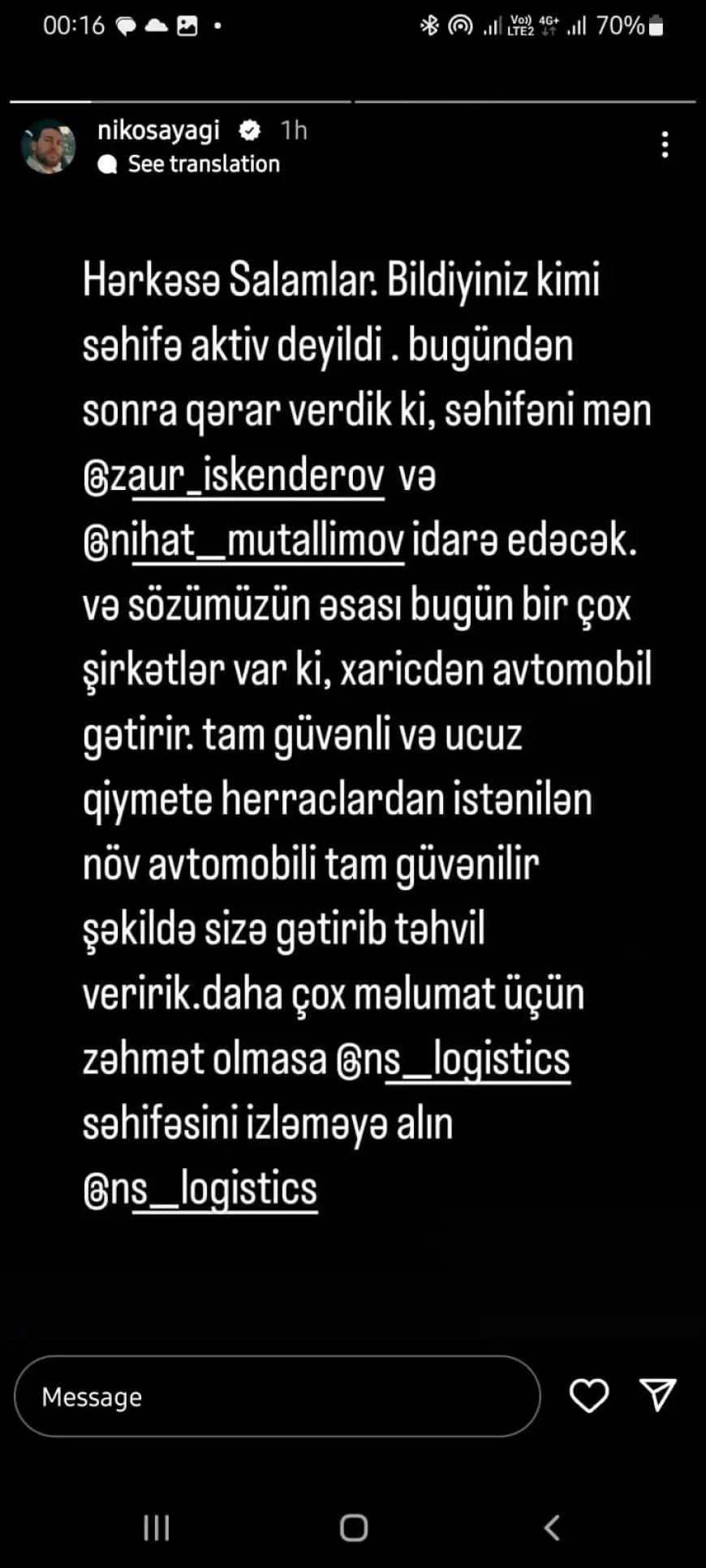 Həmçinin paylaşımda xaricdən ucuz avtomobillərin gətirilməsi üçün logistika şirkəti reklam edilib.