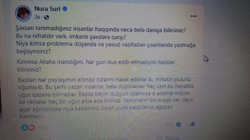 "Şəxsən tanımadığınız insanlar haqqında necə belə danışa bilirsiniz? Bu nə nifrətdir varlı, imkanlı şəxslərə qarşı? Niyə kimsə problemə düşəndə və yaxud vəzifədən çıxarılanda yazmağa başlayırsınız?