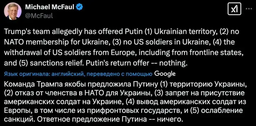 ABŞ-ın Moskvadakı keçmiş səfiri Maykl Makfol iddia edir ki, Vaşinqton Rusiya ilə mümkün razılaşma üçün bir sıra şərtlər irəli sürüb.