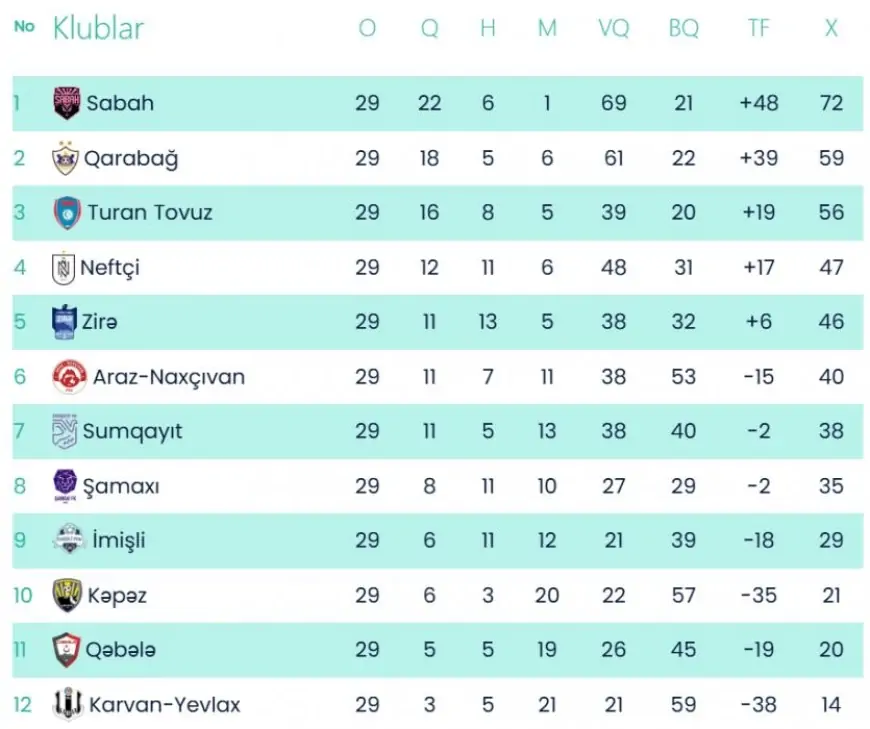 Beləliklə, Premyer Liqanın bitməsinə 4 tur qalmış “Sabah”la “Qarabağ” arasında xal fərqi 13 olaraq qalıb. Bu isə o deməkdir ki, son 4 turun nəticəsindən asılı olmayaraq “Sabah” Azərbaycan çempionu adını qazanıb.