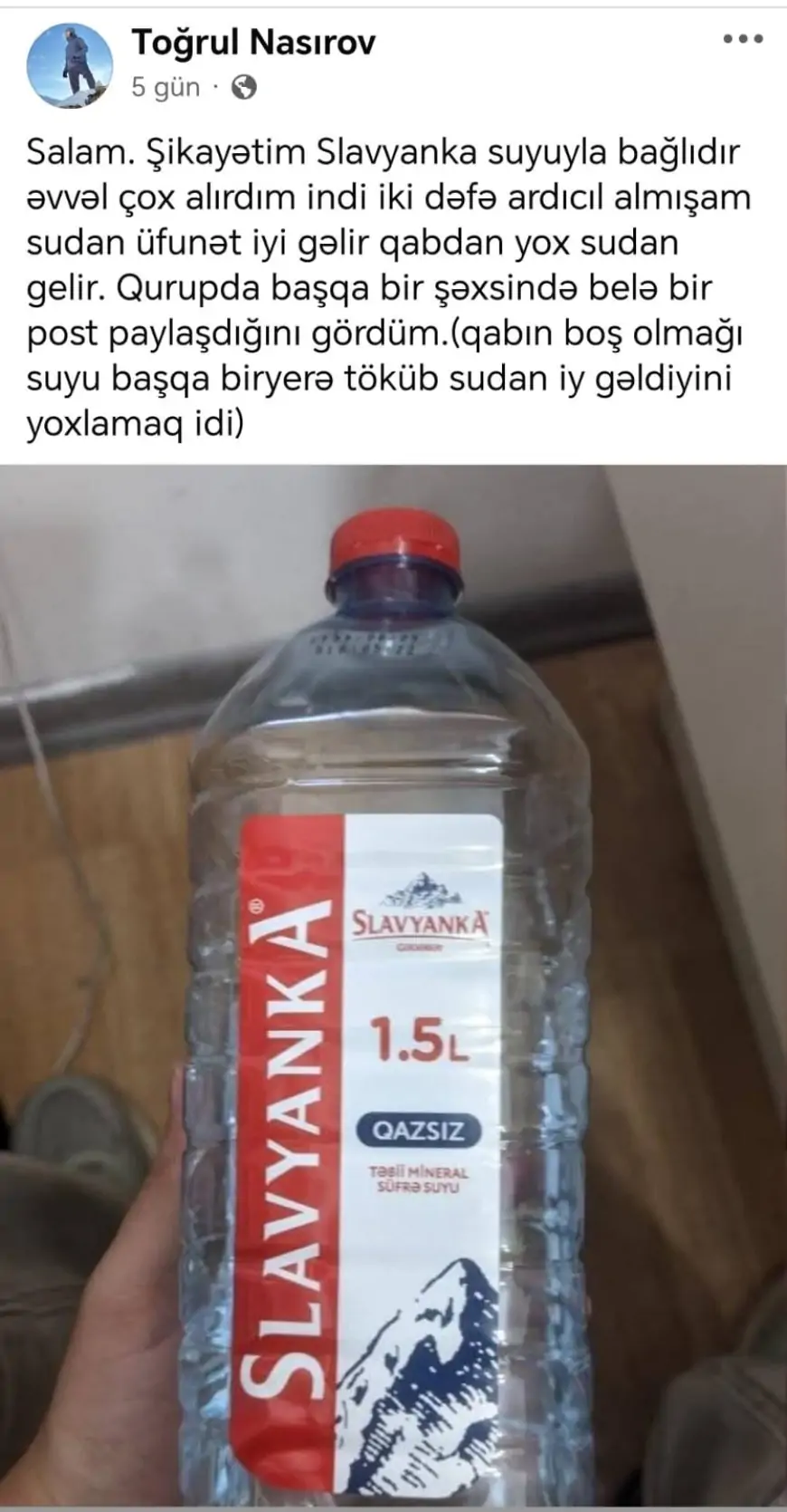 SAVASHMEDİA.az tribunainfo.az-a istinadla xəbər verir ki, sözügedən marka sudan qoxu gəlməsi ilə bağlı məlumatı şikayətçi Toğrul Nəsirov paylaşıb. O bildirib ki, uzun müddətdir istifadə etdiyi “Slavyanka” sularından son günlər pis qoxu gəlir:
