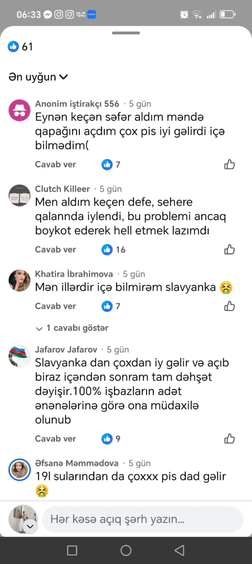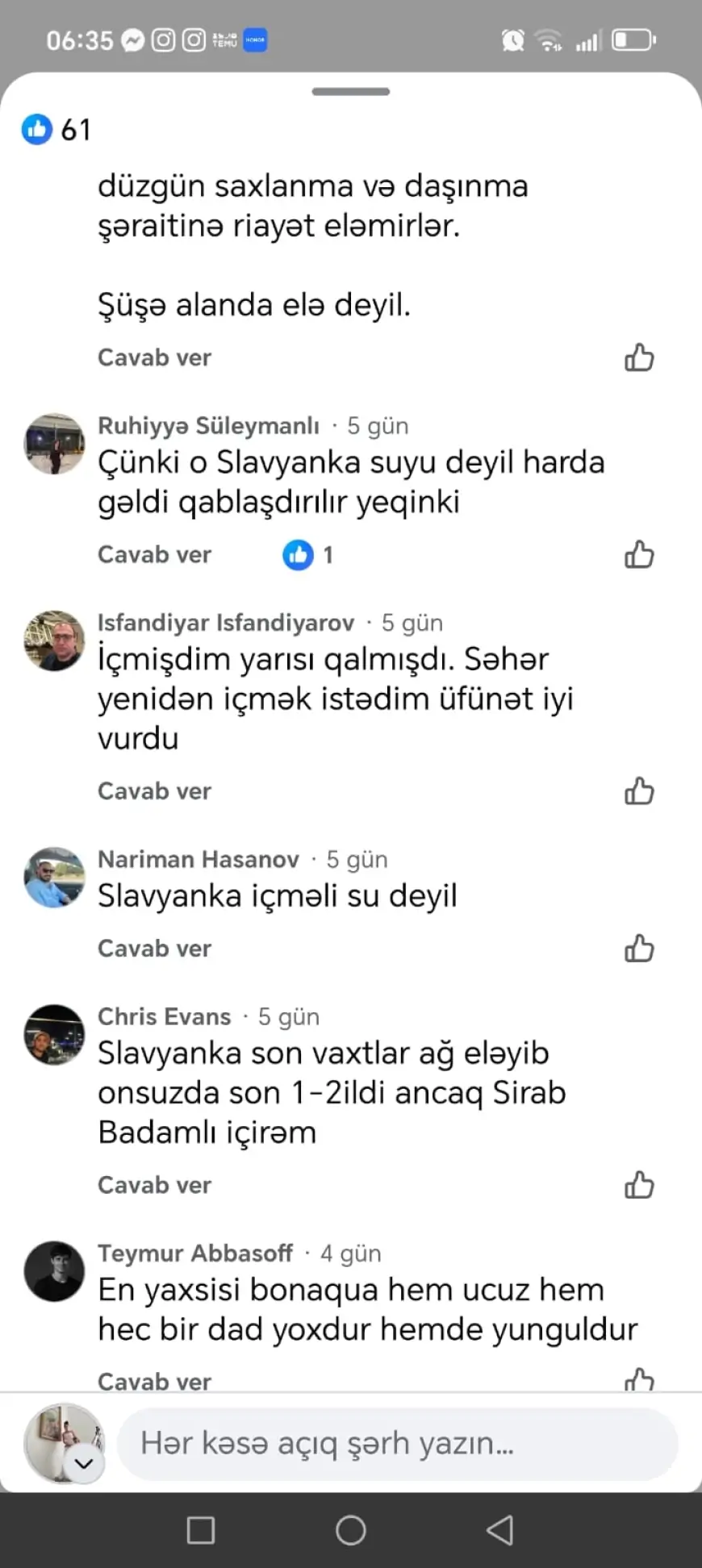 “Şikayətim “Slavyanka” suyuyla bağlıdır. Əvvəl çox alırdım, indi iki dəfə ardıcıl almışam, sudan üfunət iyi gəlir. Qoxu qabdan yox, məhz sudan gəlir. Suyu başqa qaba töküb yoxladım. Qabdan yox, suyun özündən qoxu gəldiyini bildim”.