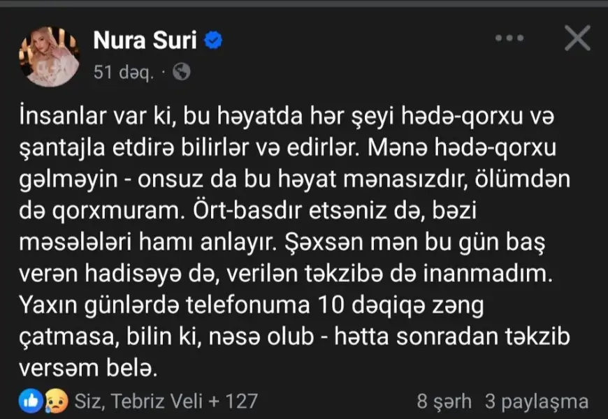 "Ört-basdır etsəniz də, bəzi məsələləri hamı anlayır. Şəxsən mən bu gün baş verən hadisəyə də, verilən təkzibə də inanmadım. Yaxın günlərdə telefonuma 10 dəqiqə zəng çatmasa, bilin ki, nəsə olub - hətta sonradan təkzib versəm belə".