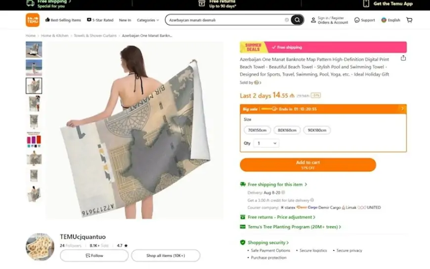 Çinə məxsus beynəlxalq elektron ticarət şəbəkəsi "Temu" Azərbaycan manatı və bayrağı formasında dəsmalların satışına başlayıb.