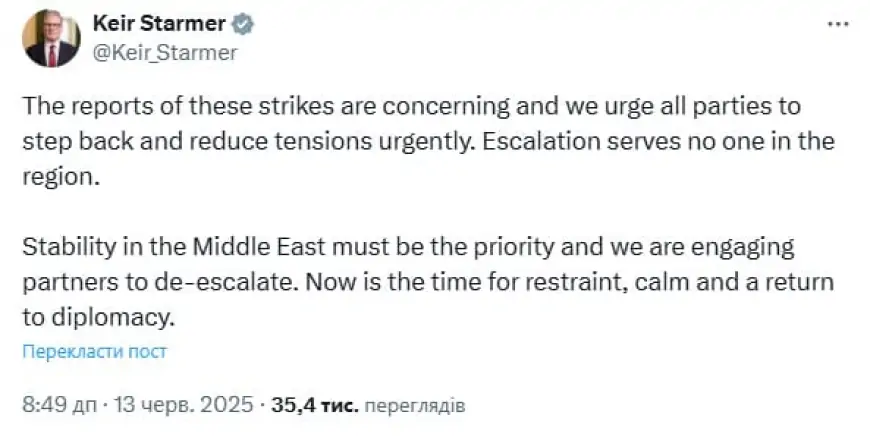 Britaniyanın baş naziri Kir Starmer İsrailin bir sıra İran obyektlərinə zərbələr endirməsindən sonra tərəfləri təmkinli olmağa çağırıb.