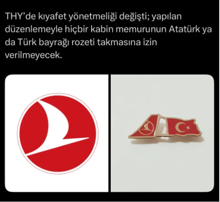 Qeyd edək ki, Türk Hava Yolları (THY) işçilərinin geyim qaydalarına dəyişiklik edib. Yeni qaydalara görə, personal yalnız üzərində THY-nin loqosu olan nişan taxa bilər. Qərardan əvvəl isə THY işçiləri Türkiyə bayrağı və M.K.Atatürkün təsviri olan nişanlar da taxırdılar.