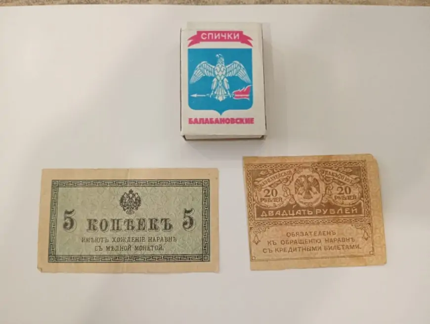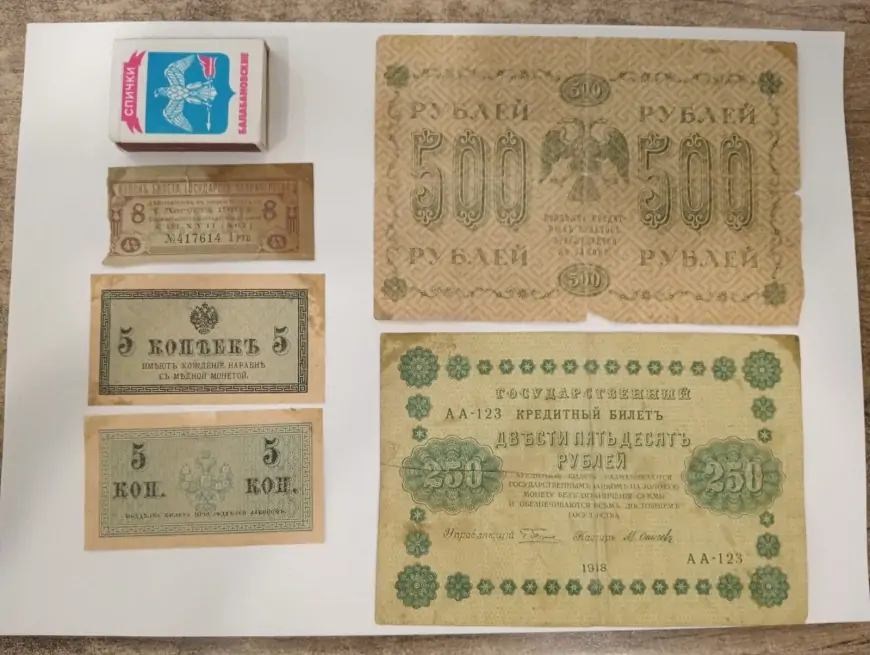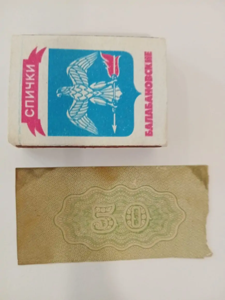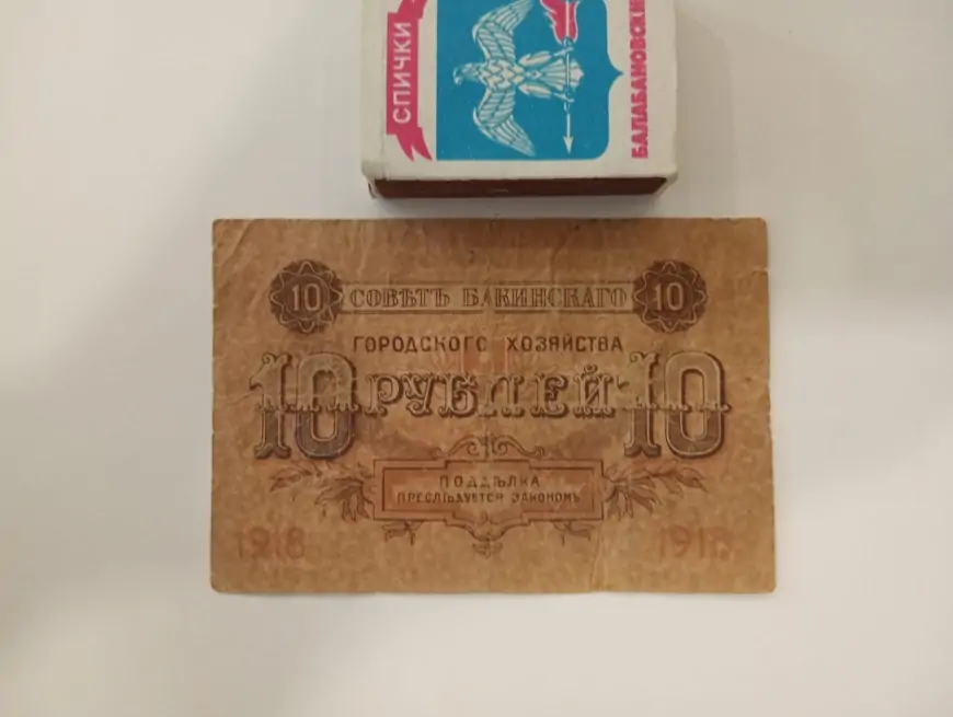 Fotolarda: kağız pul nümunələri. Kibrit qutusu əskinasın həqiqi ölçüsünə müqayisəli işarədir.