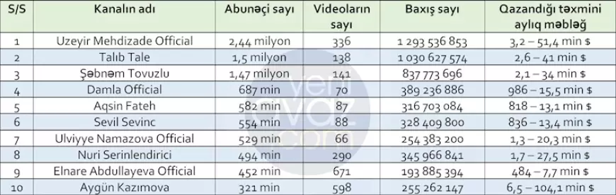"YouTube"dan ən çox qazanan azərbaycanlıların siyahısı - CƏDVƏL