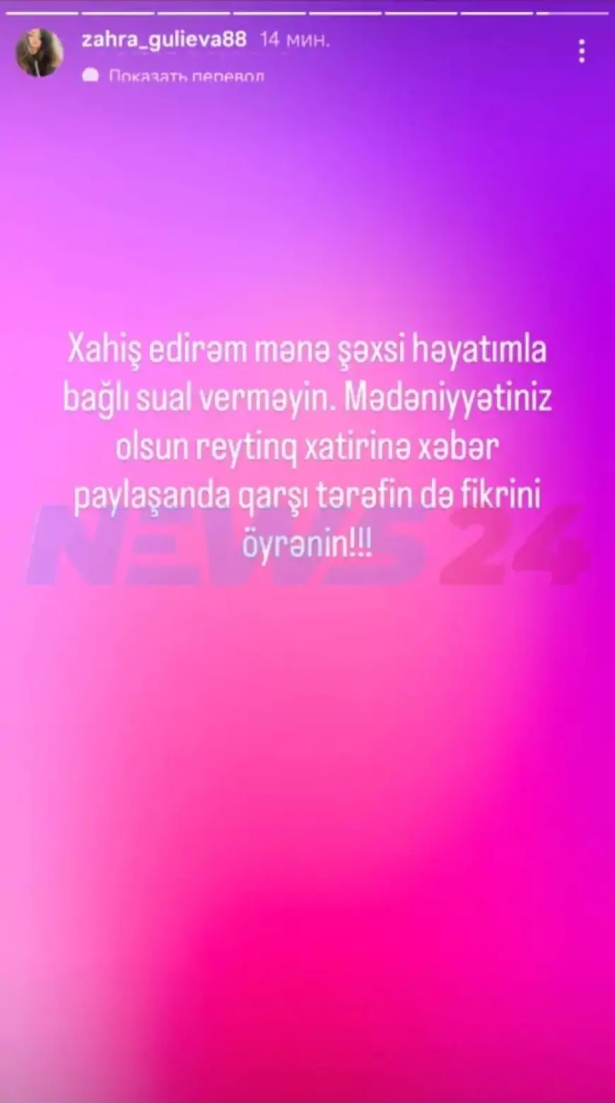 “Xahiş edirəm mənə şəxsi həyatımla bağlı sual verməyin. Mədəniyyətiniz olsun, reytinq xatirinə xəbər paylaşanda qarşı tərəfin fikrini öyrənin,” - Zəhra Quliyeva yazıb.